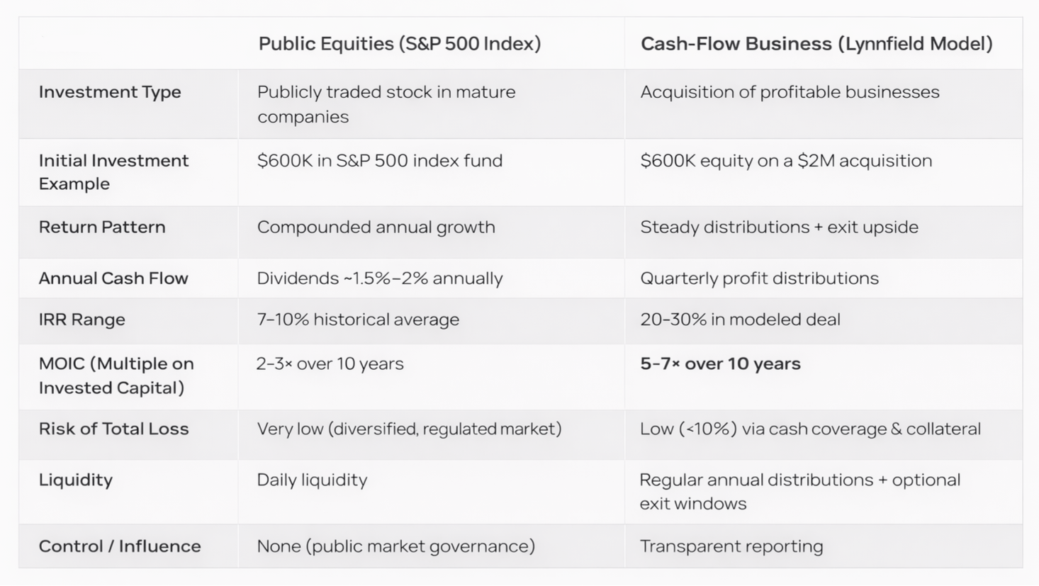 This new system places cash-flowing small businesses perfectly at the intersection of the Silver Tsunami opportunity and the limitations of public market investing. The S&P 500 delivers compounded annual growth that's entirely appreciation-dependent. A well-structured SMB acquisition delivers steady distributions plus exit upside.