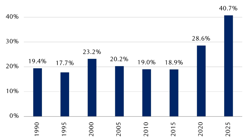 The Concentration Problem: cumulative weighing of 10 largest S&P 500 companies by year