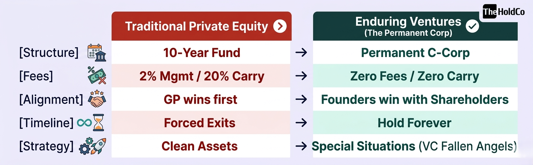 Enduring Ventures arrived at the same destination through a different structure. As a C-Corp rather than a fund, there is no timeline at all – permanent is permanent. Zero management fees. Zero carry. Management buys equity at market price alongside investors. And where Permanent Equity waits patiently for clean businesses at fair prices, Enduring goes further: they actively seek the broken situations, the padlocked offices, the startups everyone else gave up on. Higher operational complexity. Higher return targets.