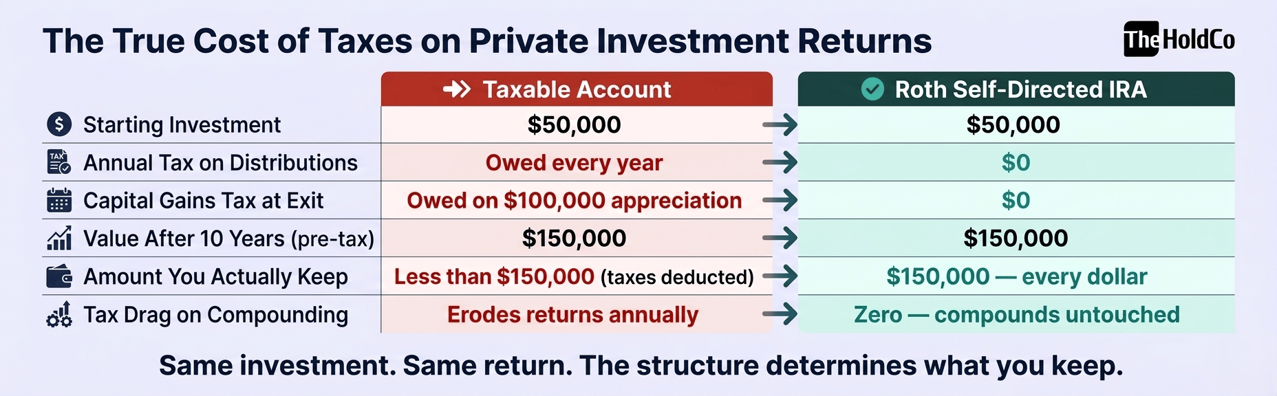 A simple example: you invest $50,000 from your Roth SDIRA into a private business. Over ten years, it generates cash distributions and grows to $150,000. In a taxable account, you owe taxes on the distributions each year and capital gains on the $100,000 appreciation at exit. In the Roth SDIRA, you keep all $150,000. No further tax due.