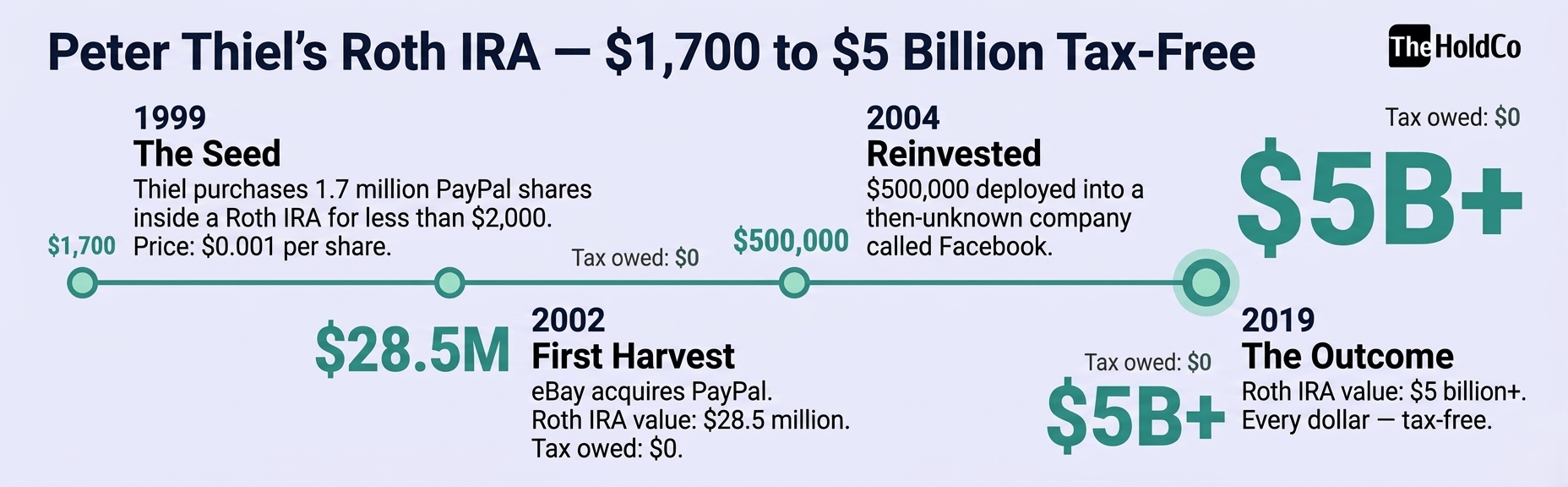 By 2002, eBay acquired PayPal, and Thiel's Roth was worth $28.5 million. He reinvested $500,000 of that into a little-known company called Facebook. By 2019, according to ProPublica's reporting, his Roth IRA was worth over $5 billion.