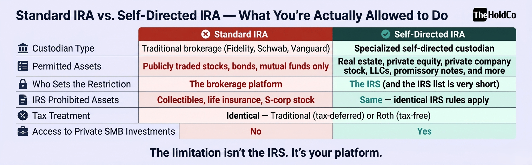 So why don't more people know about this? Because brokerage firms make money selling stocks and mutual funds. Private investments don't generate trading commissions or management fees for them. The limitation comes from the platform – not from the IRS. The IRS's actual prohibited list is remarkably short: collectibles, life insurance, and S-corp stock. That's essentially it.